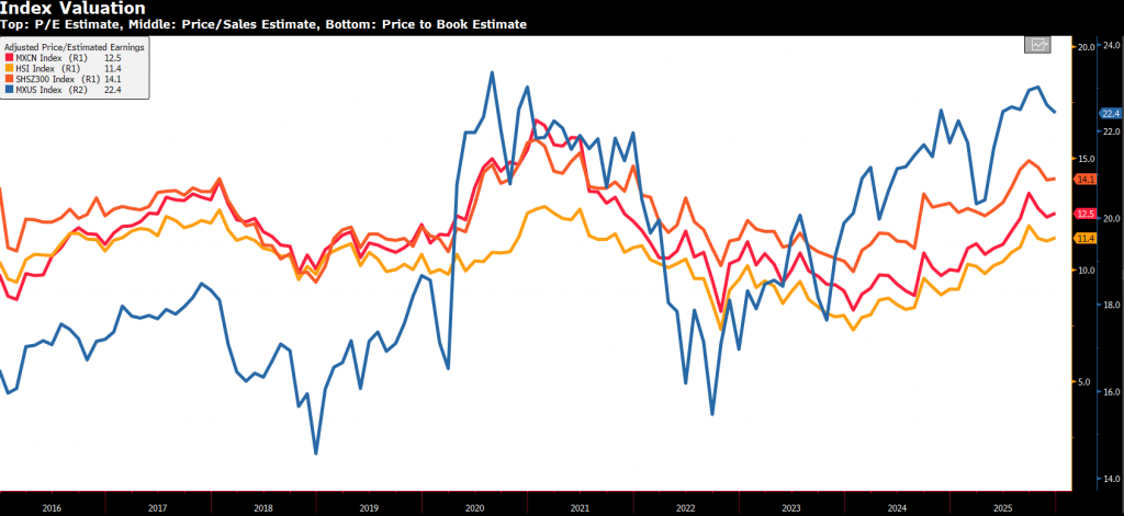 Our outlook for HK/China equities remains cautiously optimistic, with investor sentiment closely linked to policy developments both within the domestic economy and global (especially the US). While opportunities exist—particularly in sectors benefiting from structural tailwinds—a cautious and selective approach is warranted as markets navigate the uncertainties of 2025. Following the recent correction, valuations are now back to a more reasonable level. As of 30 November 2025, the HSI Index is trading at a 2026 P/E of 11.4x, compared with 12.5x for MSCI China and 14.5x for the CSI 300 Index, all notably below MSCI USA’s 22.4x.