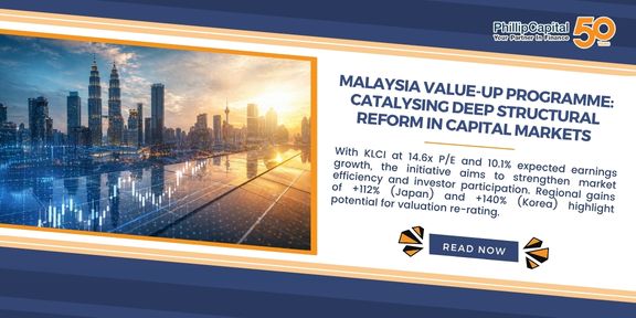 The recent Malaysia Value-Up programme may have been inspired by regional peers such as Japan, Korea, and Singapore, whose respective Value-Up initiatives have driven meaningful improvements in stock market performance and key metrics including valuations, earnings growth, and ROE (Exhibit 1). In Japan, similar capital market reforms have already demonstrated measurable impact on valuations and investor behaviour. Over this period, the market has experienced a strong re-rating, with prices increasing significantly alongside an expansion in valuation multiples. The Japanese market represented by the Nikkei 225 Index rose from 28,031 in 2023 to 59,375 in 2026 (+112%), while P/E expanded from 16.4x to 22.9x (+40%), and P/B increased from 1.6x to 2.6x (+68%). ROE improved from 9.5% (2023) to 11.4% (2026), reflecting a +1.9% of improvement. Earnings growth shifted from -15.8% (2023) to +12.3% (2026), representing a remarkable improvement.