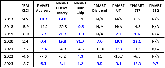 However, in the face of a challenging 2023, most of our Private Managed Accounts were able to register positive returns, outperforming KLCI which declined 2.7%. Our humble performance is credited to effective bottom-up stock selection and prudent management practices which allow us to navigate the market effectively. Please see Figure 2 for a summary of our performance across different mandates.